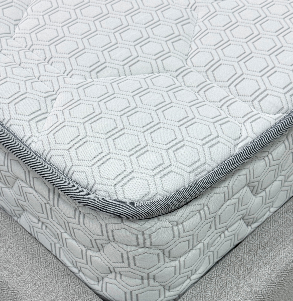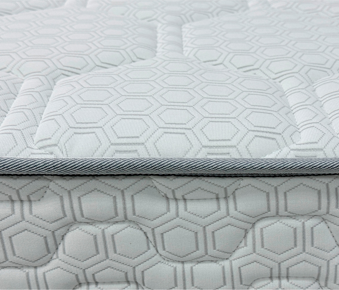 Трикотаж «Carbon» — современный и стильный материал с оригинальным рельефным рисунком «соты», который придаёт матрасу эффектный и премиальный вид. Высокая плотность ткани гарантирует её прочность и долговечность, а эластичная структура обеспечивает идеально ровное прилегание к наполнителю, сохраняя гладкость поверхности на протяжении всего срока службы. Материал обладает хорошей воздухопроницаемостью, что помогает поддерживать комфортный микроклимат во время сна, и устойчив к износу, сохраняя свой внешний вид даже при длительной эксплуатации