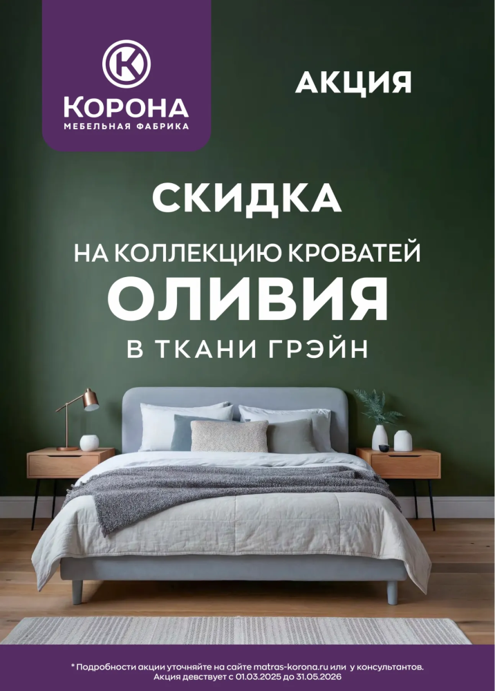 • Скидка распространяется на все кровати серии «Оливия» в ткани «Грэйн». Размер скидки уточняйте у продавцов в магазине (скидка зависит от модели и размера кровати).